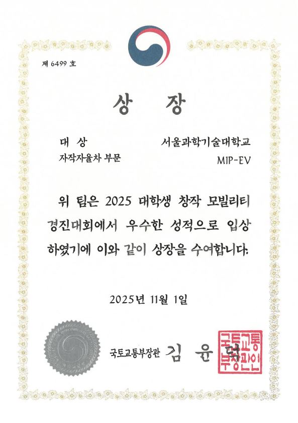 | 제목 | [MIP-EV] 「2025 대학생 창작 모빌리티 경진대회」자작자율차부문 대상 수상 | ||||