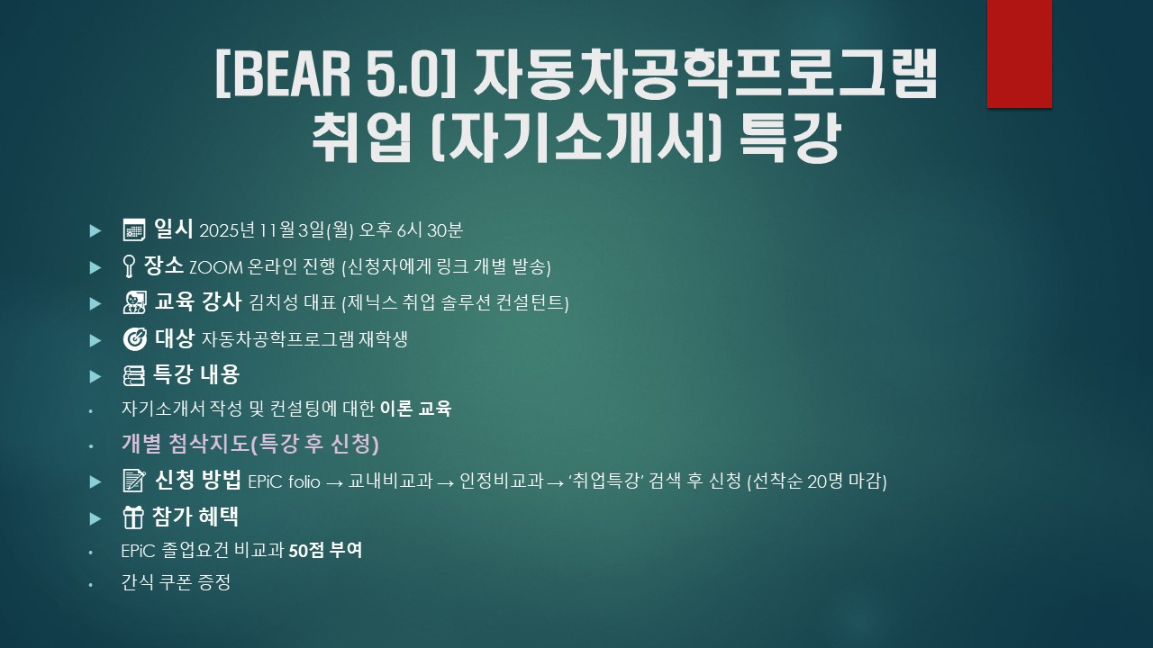 제목 | [BEAR 5.0] 취업(자기소개서) 특강(25. 11. 3.(월), 18:30) | ||||